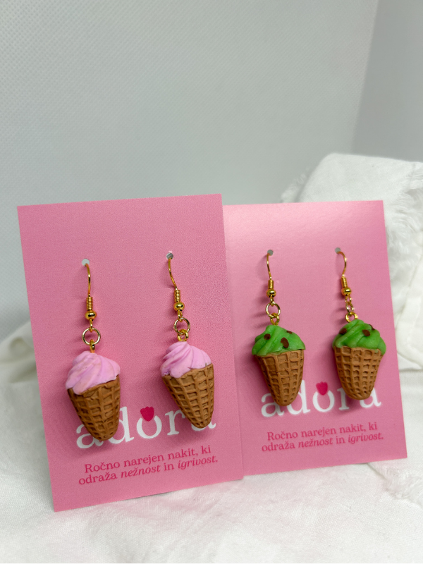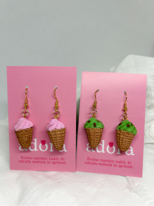 Viseči uhani v podobi sladoledov so kot nalašč za tiste, ki imajo radi igriv in svež videz. Roza barva simbolizira okus maline, češnje ali jagode, medtem ko zelena predstavlja okus mete s koščki čokolade.