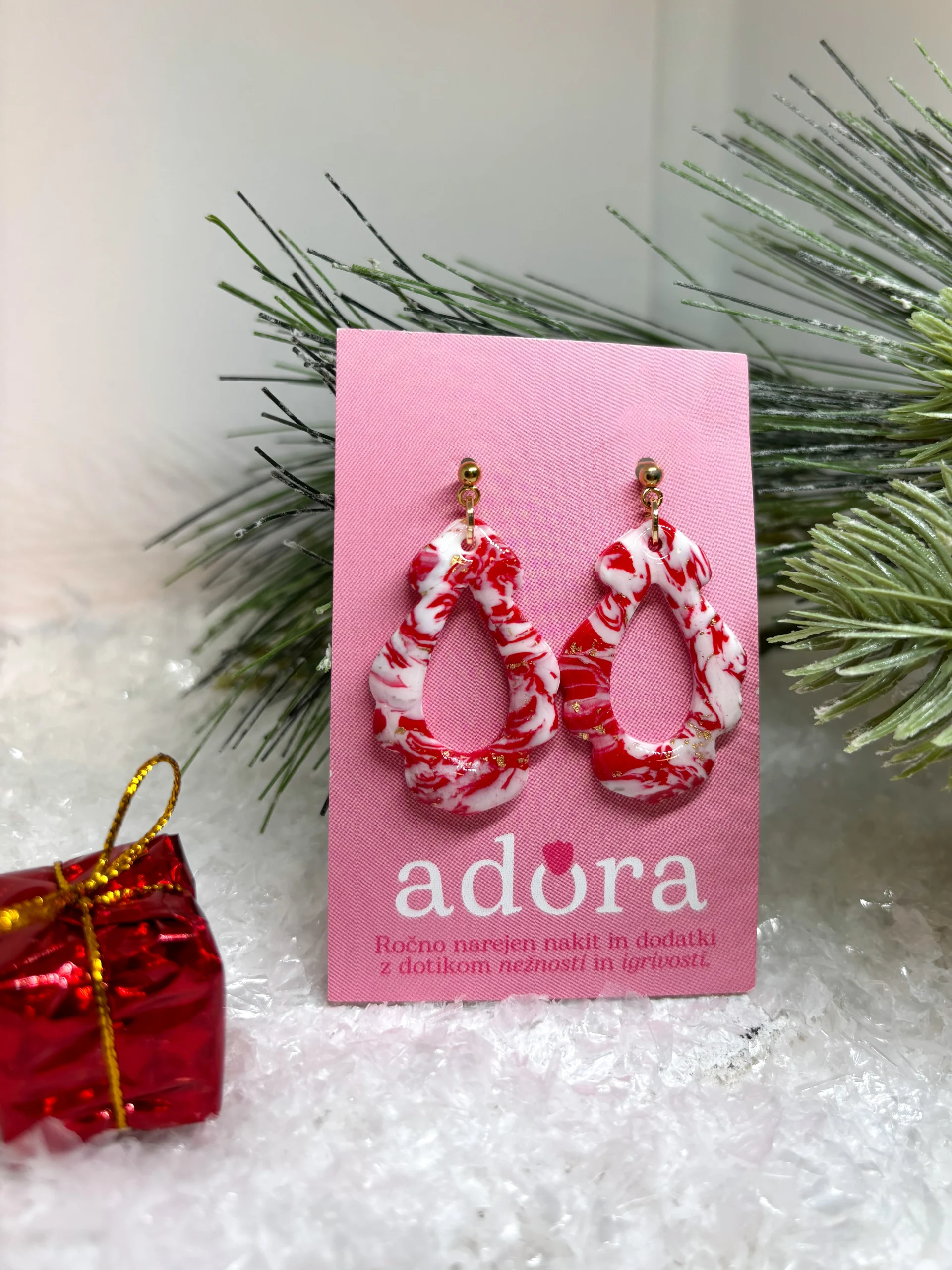 Elegantni uhani z marmornatim vzorcem, ki združujejo praznični čar in pridih prefinjenosti. Ročno izdelan dodatek za posebne priložnosti.