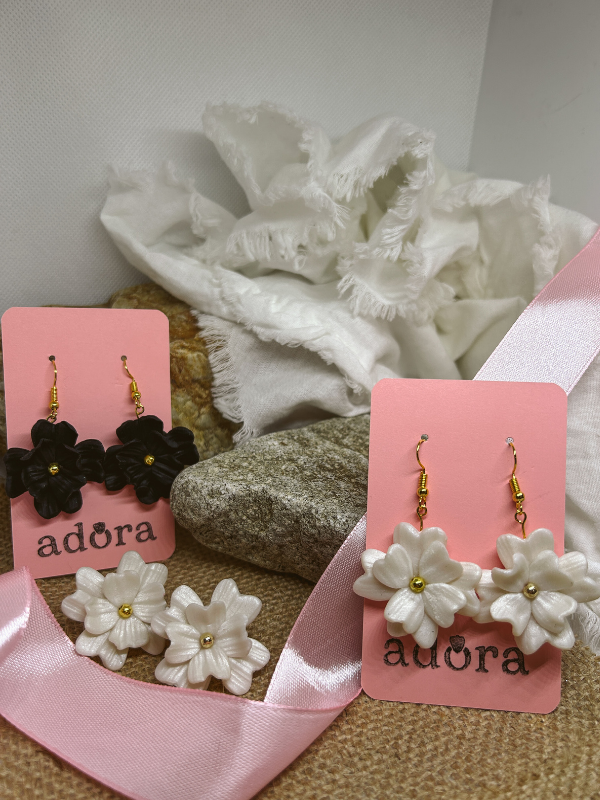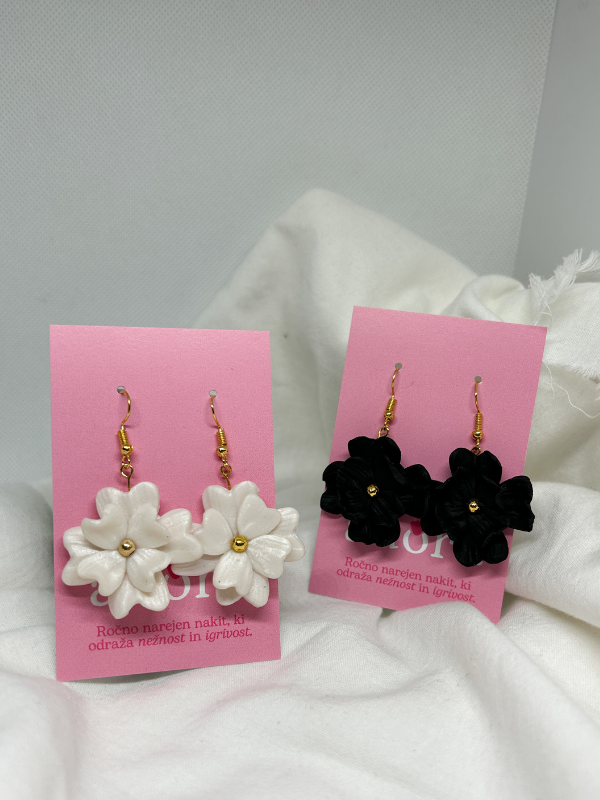 Odkrijte čarobnost ročno izdelanih unikatnih uhanov iz polimerne mase, z motivom rožnatih listov, ki bodo zagotovo pritegnili poglede in dodali eleganco vašemu videzu. Na voljo so v perla belem (bleščečem) ali črnem odtenku. Oba odtenka dodajta pridih klasične lepote. Ob predhodnem dogovoru je možno naročilo v drugih barvnih odtenkih.