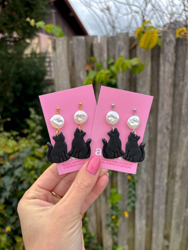 Uhani Mystic z motivom črne mačke in svetleče lune – ročno izdelani uhani za eleganten in skrivnosten videz. Predvsem primerni za praznovanje Halloweena.