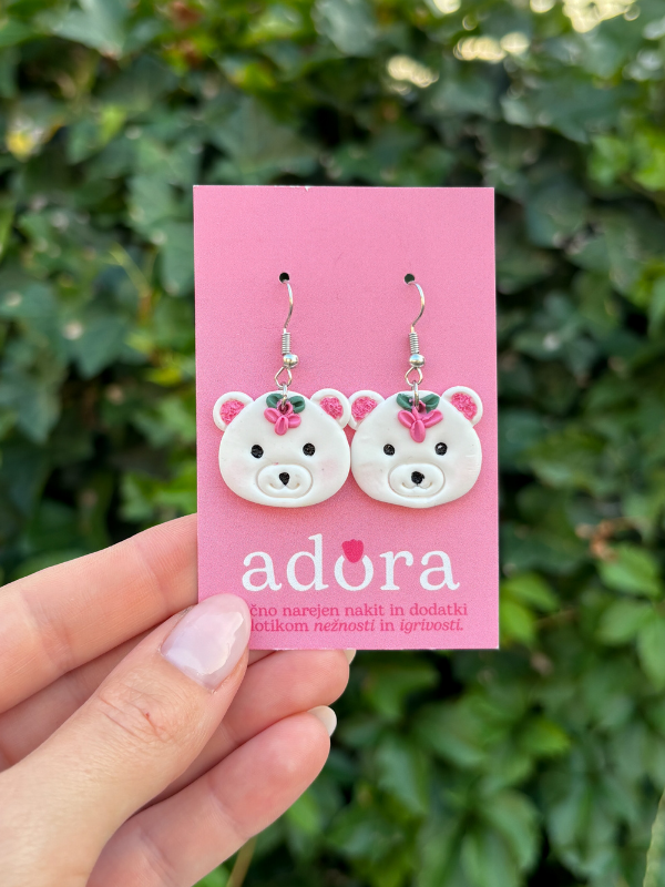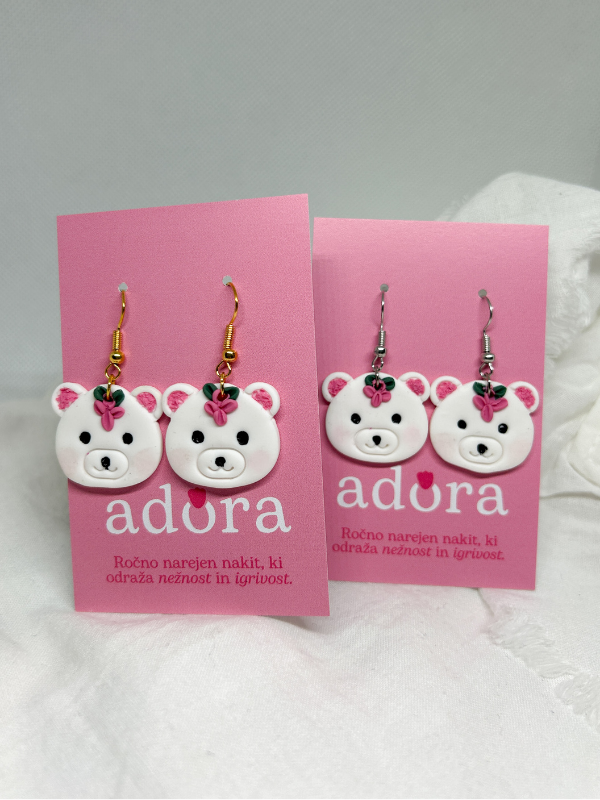 Očarljive bele medvedke z nežnimi rožnatimi cvetovi prinašajo igrivost v vsakdanji slog. Ročno izdelani z ljubeznijo. Rožnata lička ustvarjajo romantičen pridih. Izjemna kakovost in ljubek dizajn jih naredita popolno izbiro za vsakodnevno nošenje.