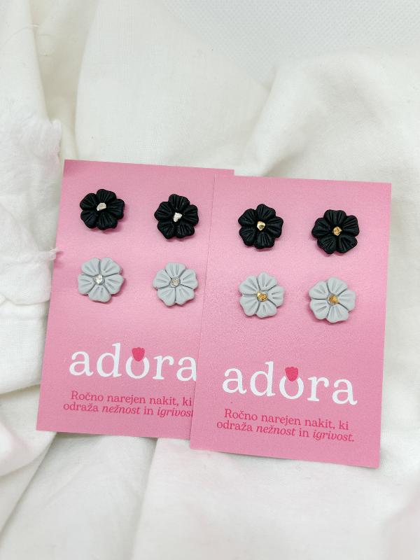 Kompletek nevisečih rožic uhanov iz polimerne mase. Ti uhančki v sivi in črni barvi so popolni za vsakodnevno nošenje. Ob predhodnem dogovoru je možno naročilo v drugih barvnih odtenkih.