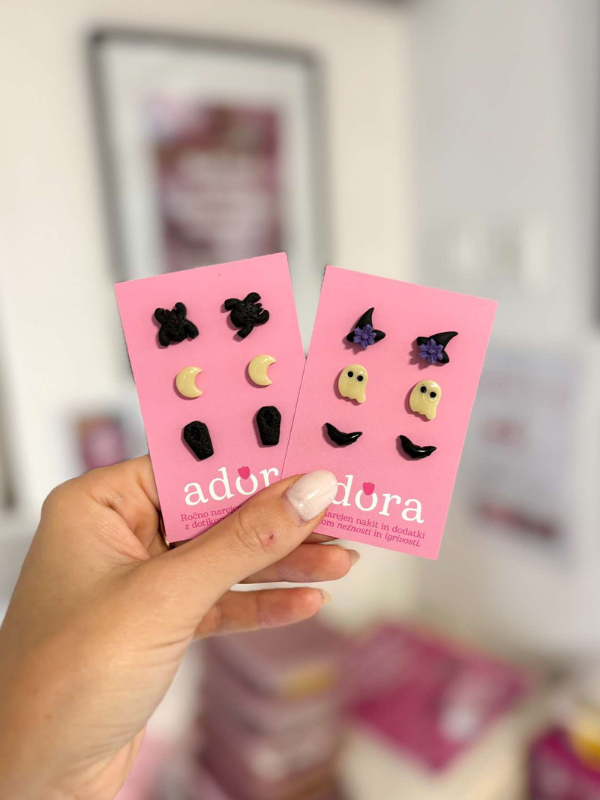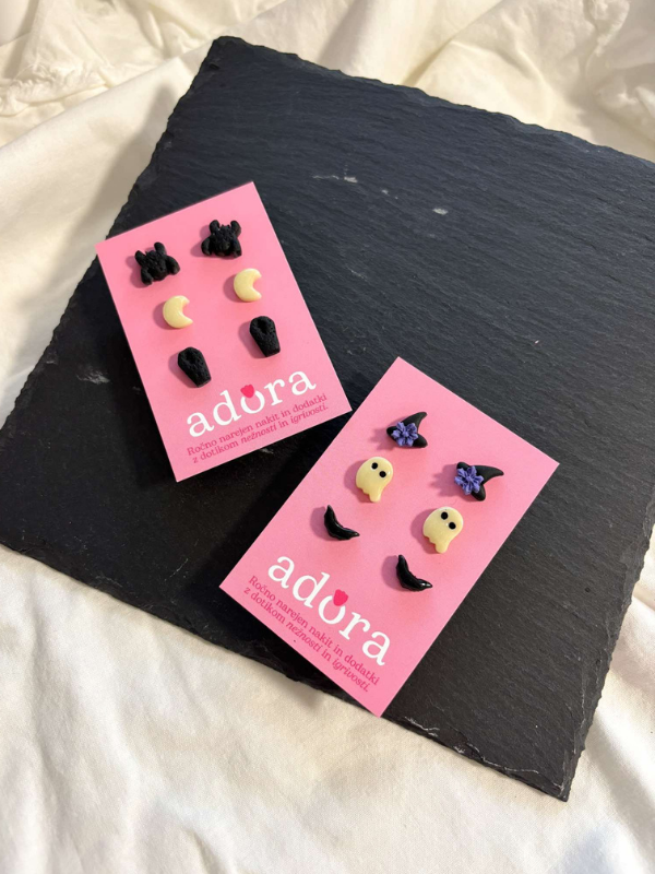 Uhani Witchy iz omejene Halloween izdaje s prikupnimi motivi pajkov, lun, krst, duhcev, klobukov in netopirjev – duhci in lunice celo svetijo v temi! Verzija A: Komplet pajki, lune, krste | Verzija B: Komplet čarovniški klobuk, duhci, netopirji